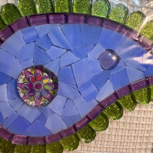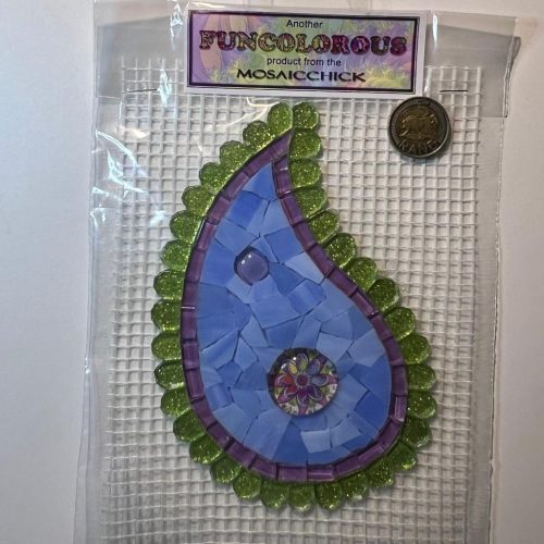A vibrant mosaic paisley insert to use in your work or on it’s own on a wall or fence. These inserts are very attractive and will complement any design beautifully. It is plus/minus 3mm thick but some are thicker in parts due to bubbles. The paisley is approximately 170mm long and 120mm wide.